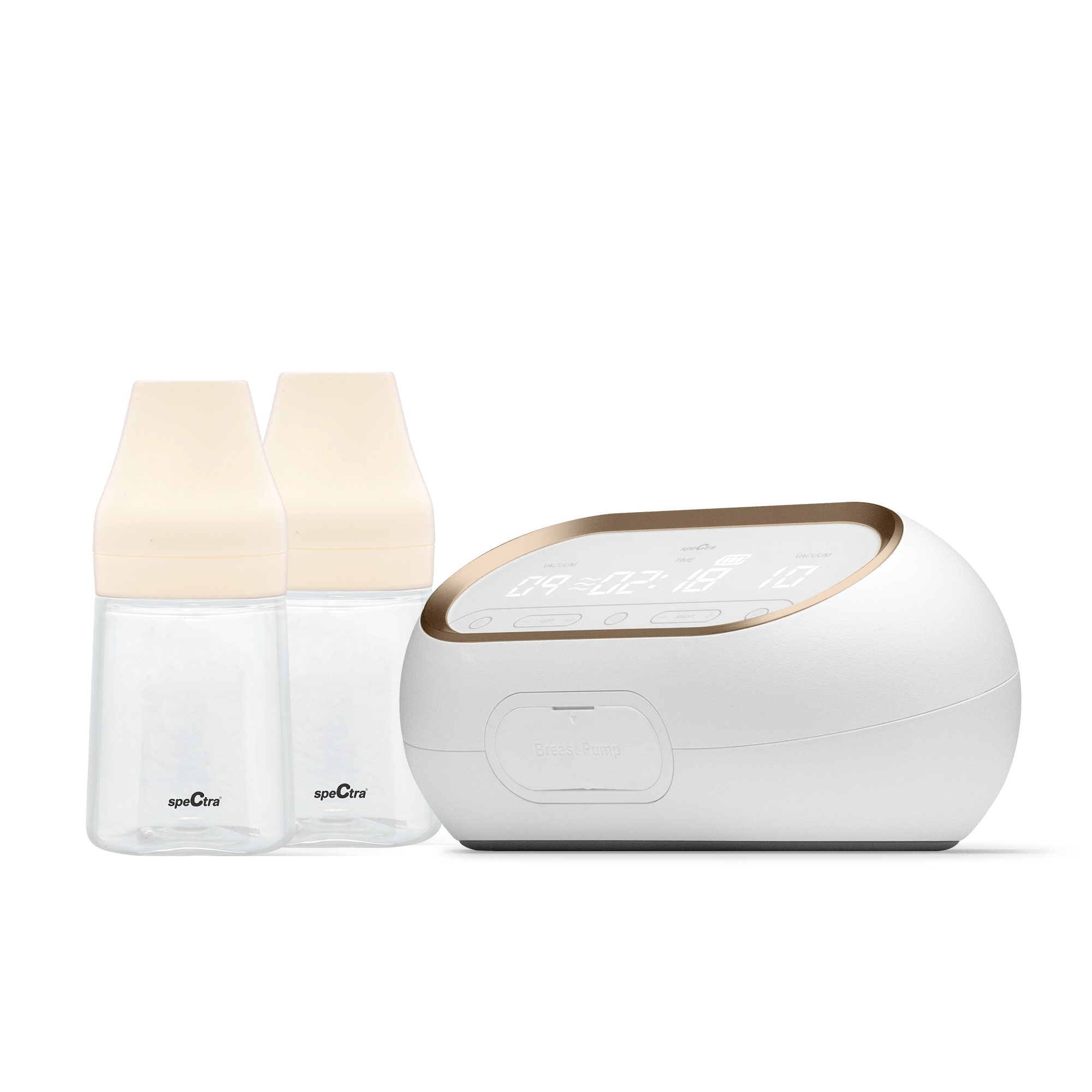 - Two (2) Spectra Wide Neck Storage Bottles. Includes nipple, disc, cap, and cover for each bottle